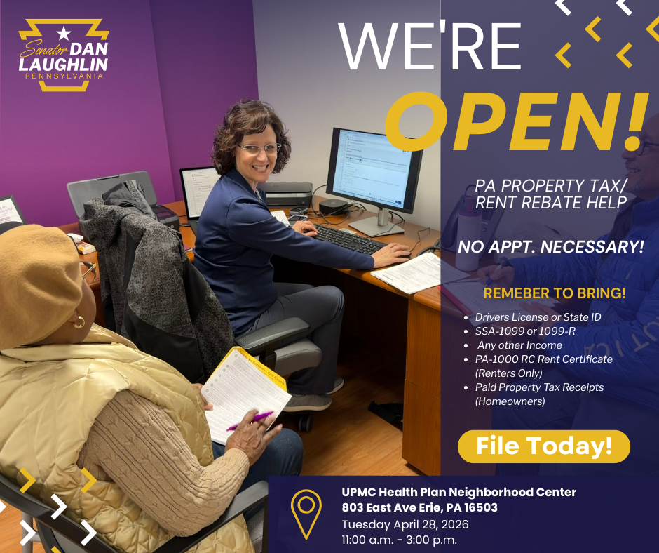 Erie’s startup ecosystem continues to gain traction with the announcement of a new TechCelerator cohort. Ben Franklin Technology Partners of Central & Northern PA, in partnership with ECGRA, introduced eight Erie-based companies selected for the program. The TechCelerator provides early-stage startups with hands-on support to refine business models, validate markets, and prepare for investment opportunities. In Your NeighborhoodA member of my staff will be hosting satellite hours at the UPMC Neighborhood Center, 401 East Ave., on Tuesday, April 28 from 11 a.m. to 3 p.m. Stop in to get help filling out your Property Tax/Rent Rebate application or to discuss any state-related issues. We’re here to help. Connecting with Conneaut Township